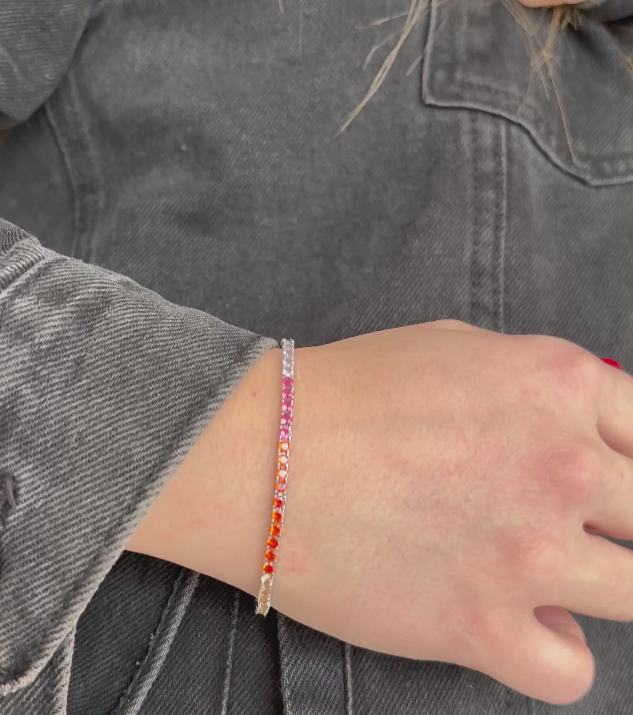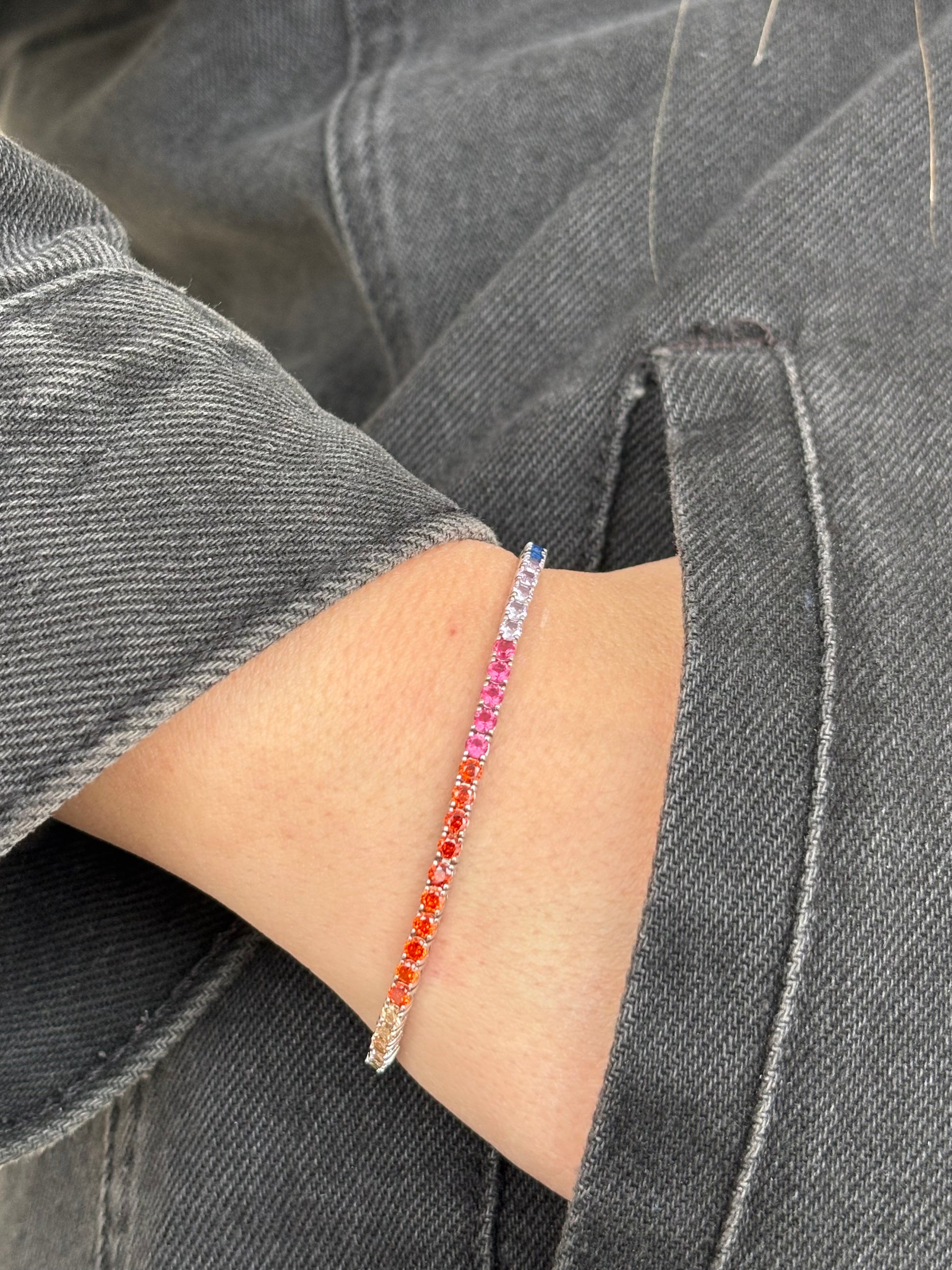 Illumina il tuo stile con Tennis Aurora Gradient, un bracciale in argento 925 impreziosito da una sequenza armoniosa di zirconi colorati che sfumano dal blu al rosa fino al rosso e all’arancio. L’effetto dégradé crea un gioco di luce unico, perfetto per chi ama accessori raffinati ma dal carattere vivace. Leggero, elegante e versatile, è ideale sia per look casual che per occasioni speciali, aggiungendo un tocco di colore sofisticato al polso.