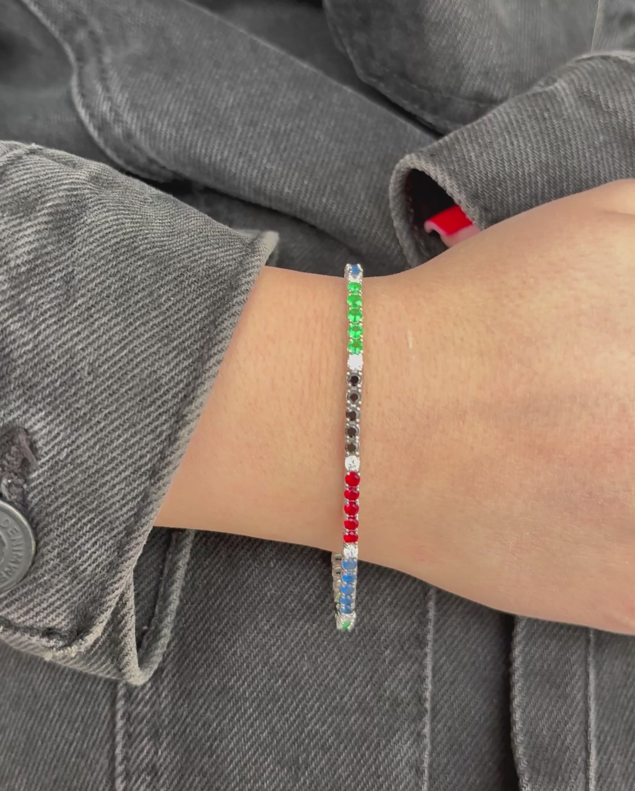 Vivace, elegante e ricco di personalità: Tennis Color Symphony in argento 925 unisce zirconi rossi, blu, verdi e bianchi in una sequenza armoniosa che illumina il polso con un tocco unico. La linea sottile mantiene un’eleganza classica, mentre i colori vividi aggiungono freschezza e modernità. Perfetto per chi ama distinguersi con un accessorio raffinato ma allegro, capace di valorizzare qualsiasi outfit con stile e carattere.