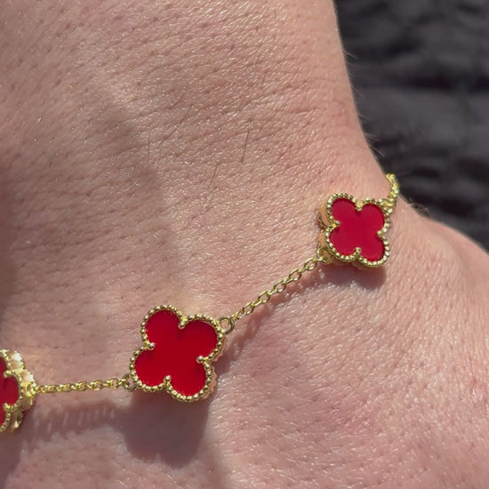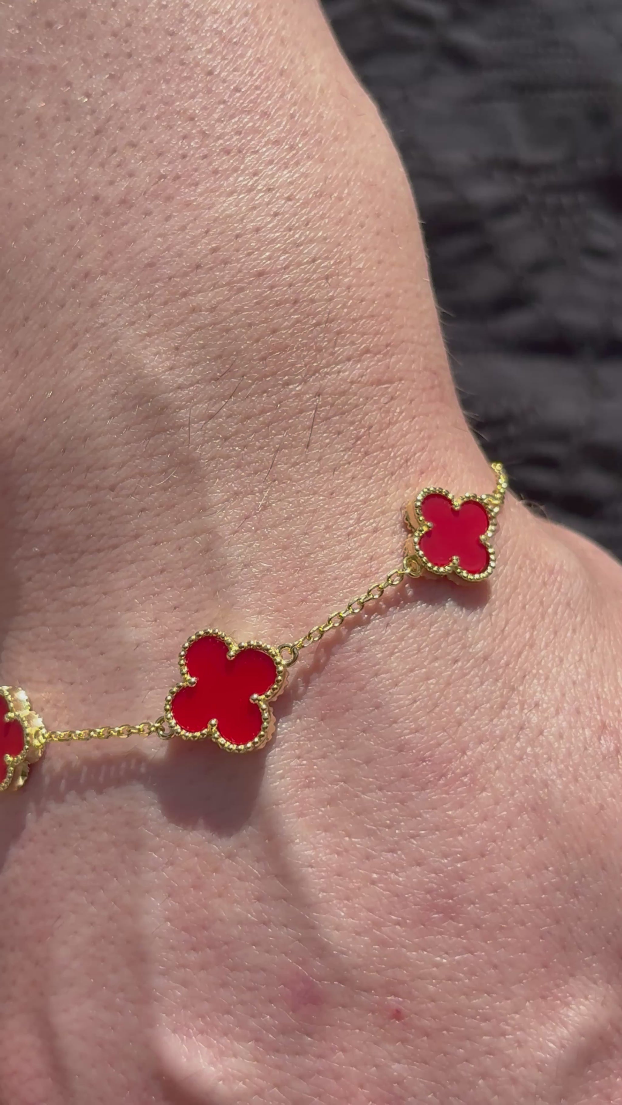Un bracciale elegante e d’impatto, realizzato in argento 925 placcato oro, impreziosito da una sequenza armoniosa di quadrifogli smaltati rosso corallo. Il contrasto tra il rosso vivo e la finitura dorata crea un effetto luminoso e audace, perfetto per chi ama distinguersi con stile.