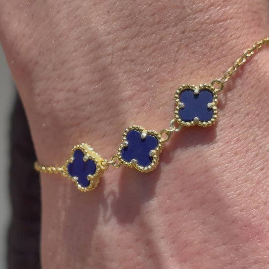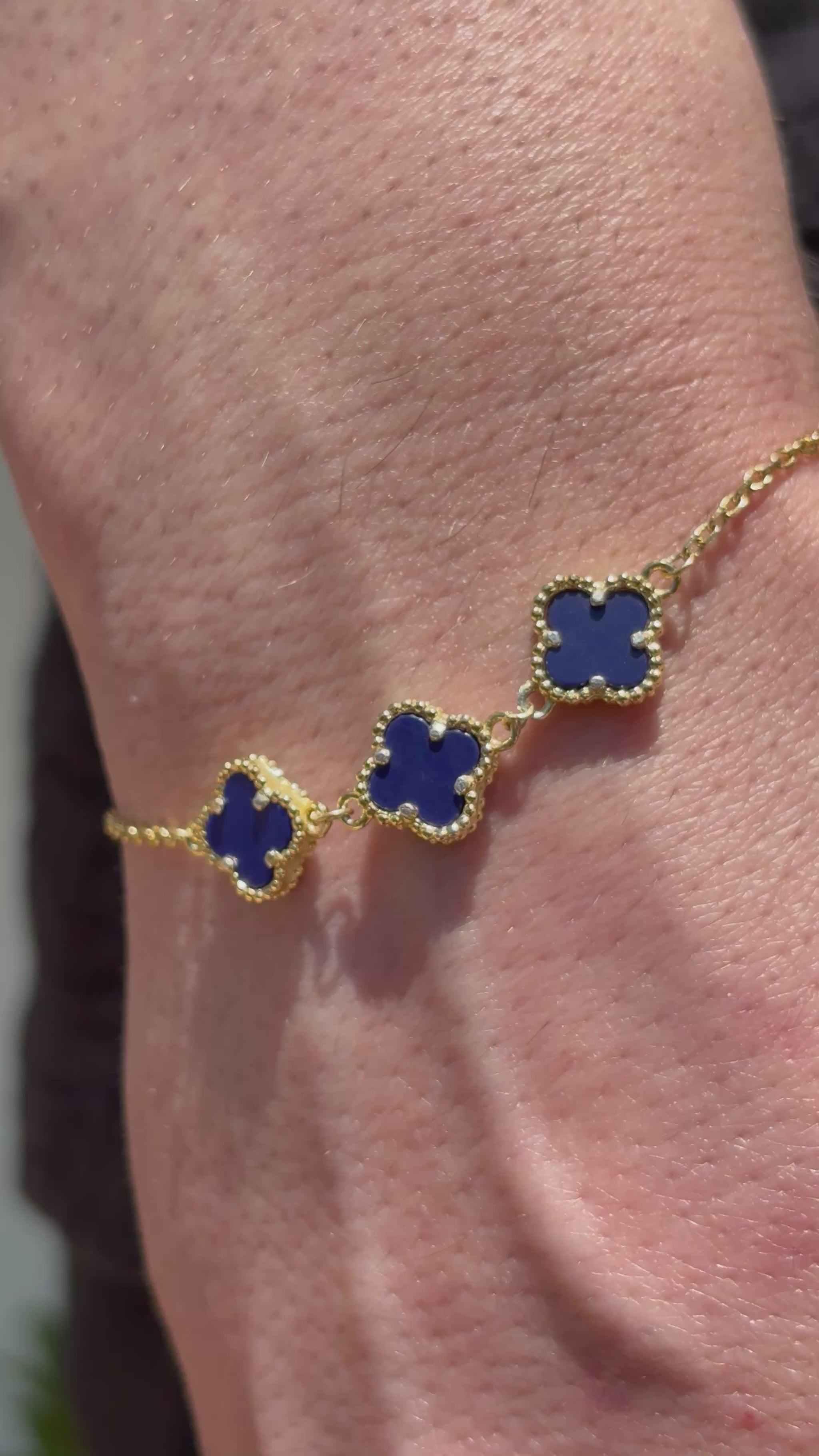 Un bracciale che unisce il fascino del colore e l’eleganza dei dettagli. Realizzato in argento 925 placcato oro, questo gioiello è composto da una serie di quadrifogli smaltati in blu notte, impreziositi da un bordo dorato lavorato che dona luce e movimento al polso.