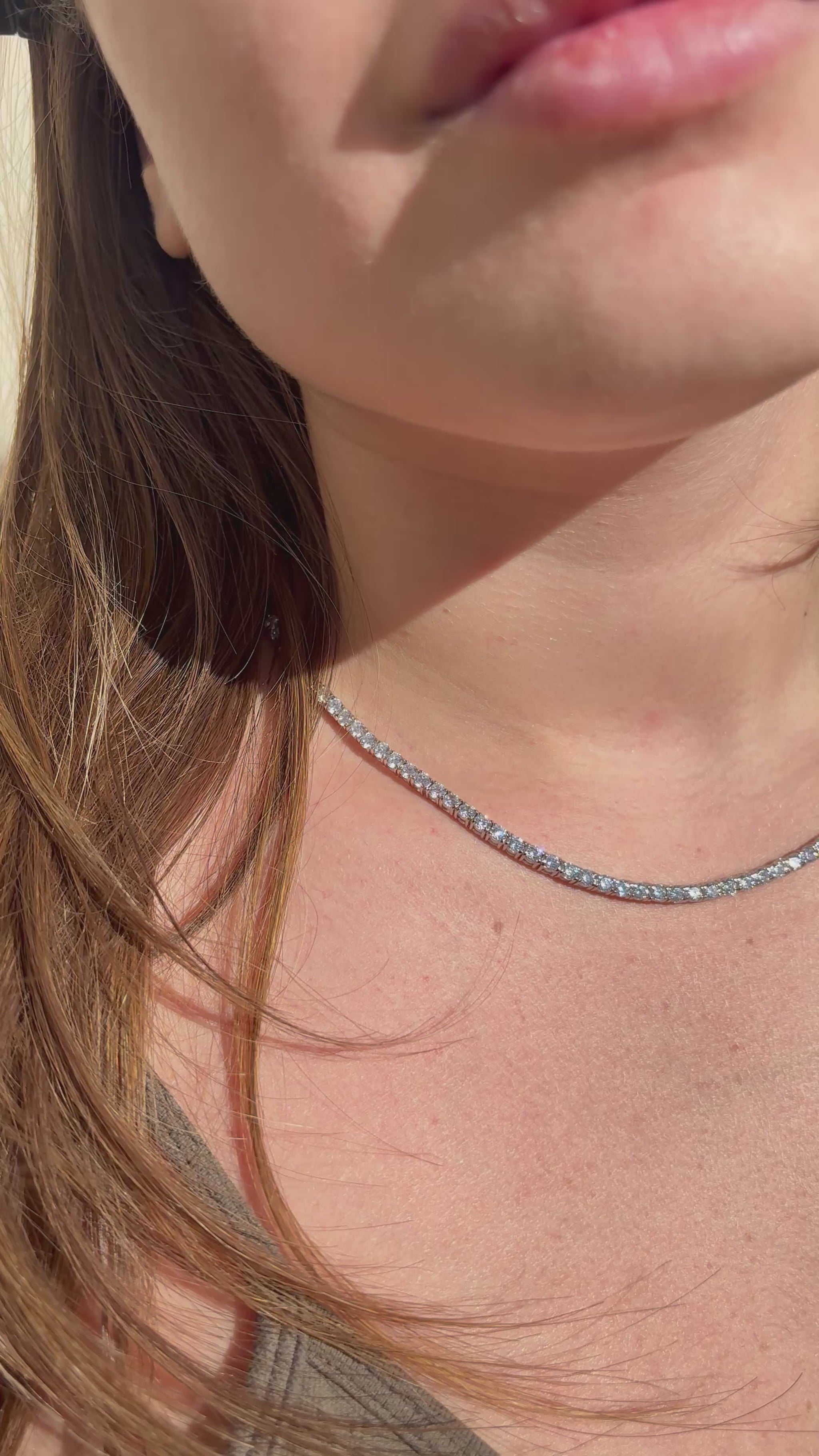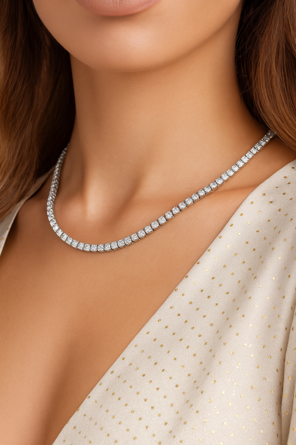 La collana Tennis “Luce Pura” è realizzata in argento 925 e impreziosita da una sequenza continua di zirconi taglio brillante, incastonati uno ad uno per garantire una luminosità intensa e uniforme.